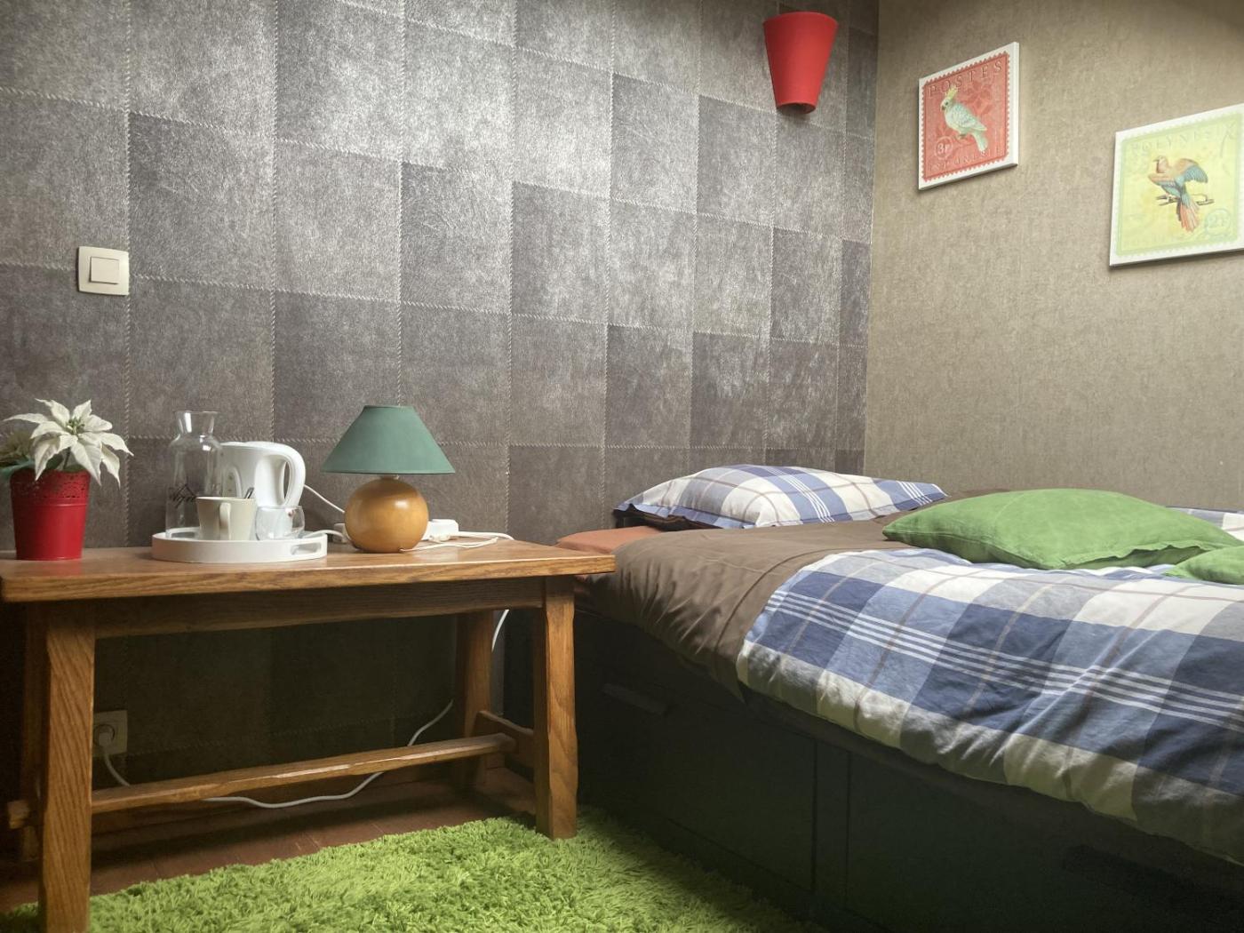 Small Double Room with Shared Bathroom. Located on the 2nd floor under the roof, this double room has a chalet feeling. A shared bathroom is available and also a living area with a TV and DVDs is to be found on the other floor. There are goose feather pillows, and extra pillows are available upon request. Twin beds or a double bed can be request. The 1.40 x 2.00 m double bed includes a memory foam mattress. ;