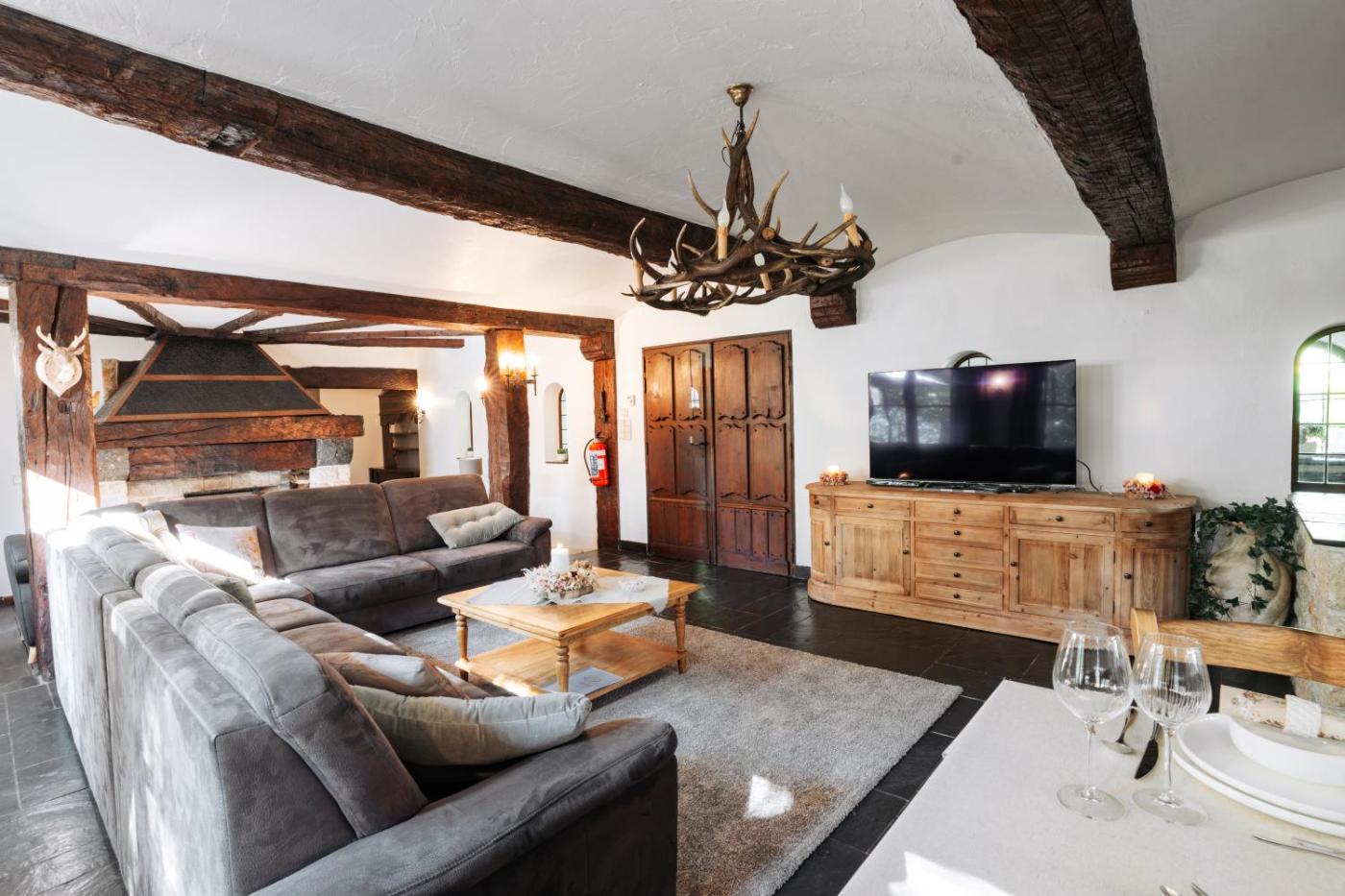 Deluxe Villa. This villa offers a fireplace. This spacious villa comprises 1 living room, 7 separate bedrooms and 4 bathrooms with a bath and a shower. Guests will find a stovetop, a refrigerator, a dishwasher and an oven in the well-equipped kitchen. The villa also provides guests with a barbecue. Featuring a terrace with garden views, this villa also provides a private entrance and a flat-screen TV with streaming services. The unit offers 12 beds.